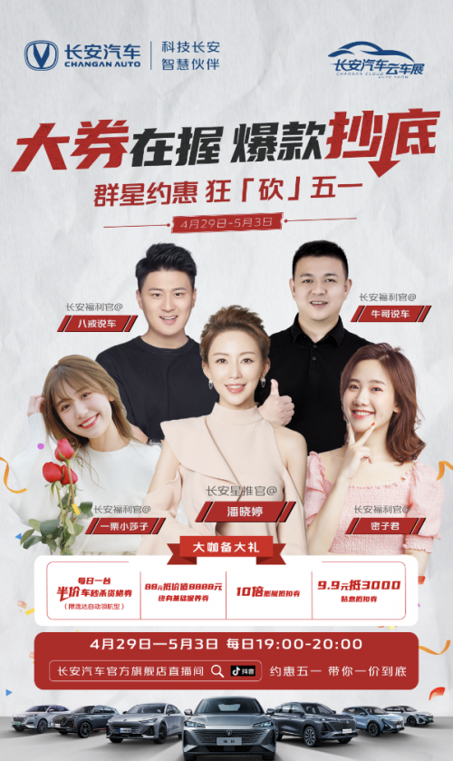 尤其在4月29日-5月3日假期期间,“长安汽车官方旗舰店”抖音直播间的互动与福利更加精彩。长安汽车将连续五天每晚7点-8点,分别邀请潘晓婷、一栗小莎子、密子君、八戒说车、牛哥说车五位大咖,为消费者发放重磅福利。与此同时,达人大咖还将分享爆款车型的品鉴体验,精彩互动与购车惊喜将同步“价”临。
