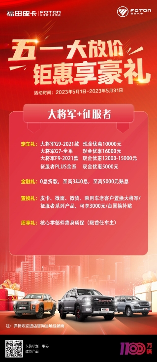 过去的一年福田皮卡实现产销50万台,为回馈老客户,感恩用户信赖,在五一假期来临之际,福田皮卡开启“五一大放价 钜惠享好礼”系列促销活动,在5月1日-5月31日期间购买福田皮卡,赢现金优惠定车礼,大将军G9-2021款,现金优惠10000元;大将军G7-全系现金优惠16000元;大将军F9-2021款现金优惠,2000-15000元;征服者PLUS全系现金优惠5000元;除此之外,还有 0利息贷款,至高5000元贴息,3000元置换礼及核心零部件终身质保 (限首任车主)。这样有诚意的福利,你还等什么!