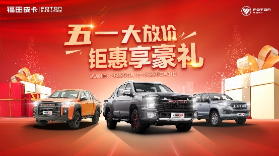 五一大放价 钜惠享好礼,福田皮卡五月钜惠来袭,让你轻松拥有心仪座驾。5月1日至5月31日,福田皮卡大将军系列、征服者系列产品火热促销正式开启,定车礼、金融礼、置换礼、质享礼四重大礼,至高优惠24000元。