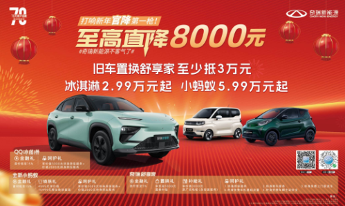年味加满,快乐新启。奇瑞新能源携手旗下奇瑞小蚂蚁、QQ冰淇淋和奇瑞舒享家,为人们带来丰富的“年货”优选,为新年出行保驾护航,多重好礼买车用车皆无忧,心动“年货”,速囤!