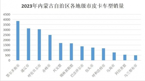 值得一提的是,自2019年以来,内蒙古皮卡市场一直保持高歌猛进的状态,近年来全省销量一直稳居全国前列。从区域销量来看,内蒙古下辖各市表现相对均衡,除了鄂尔多斯具备领先优势外,通辽、呼伦贝尔、赤峰等地皮卡销量较多且表现接近。包头皮卡年销量虽然过千,但排名位于中后段,此次放开皮卡进城后,将产生一定刺激作用,存在进一步挖掘的空间。