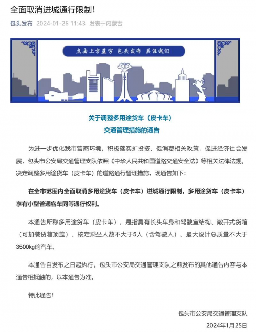 自2016年皮卡解禁试点至今,例如山东、江苏等经济强省的省会纷纷放宽了皮卡进城限制,目前全国已有97%以上的地级以上城市取消皮卡进城限制。包头市的皮卡解禁政策,不仅是对市场需求的有力回应,更是对国家皮卡解禁大趋势的积极响应。这一政策的实施,意味着皮卡车在包头市内将享有与小型载客汽车同等的通行权,也将极大提升皮卡车型在当地的普及度和受欢迎程度。