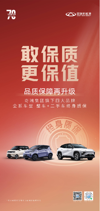 值得一提的是,奇瑞新能源始终以用户为中心,在承诺三电终身质保、整车终身质保后,品质保障再升级,全系车型整车+二手车终身质保,不仅保质,更加保值,真正凸显奇瑞新能源以强大企业实力和坚实产品品质为用户打造全方位悉心呵护,让每一位家人都能享受安心、放心、省心的出行生活。