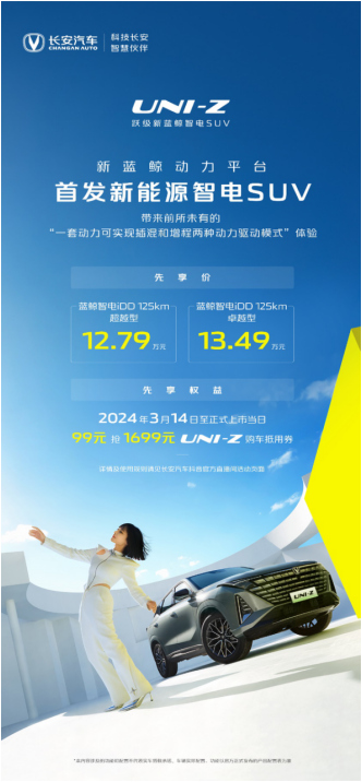 3月13日,全新跃级新蓝鲸智电SUV——长安UNI-Z先享计划正式开启。长安UNI-Z是长安新蓝鲸动力首发车型,先享发布两款配置,蓝鲸智电iDD 125km超越型先享价12.79万元、蓝鲸智电iDD 125km卓越型先享价13.49万元。另外,长安UNI-Z为用户提供先享权益:自2024年3月14日至正式上市当日,用户可99元抢1699元UNI-Z购车抵用券。