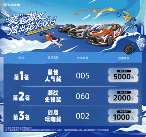 在潮流与创新的碰撞中,奕炫家族凭借炫酷的车身造型、得天独厚的改装潜力,让潮改玩+们尽情释放自己对汽车文化的理解和热爱,展示自己对于车辆颜值、性能的渴望和追求。值得一提的是,本次活动的部分优秀作品还将有望成为奕炫家族赛车战衣,与风神一同征战赛道,共享荣誉。