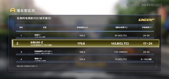 在纯电续航测试环节中,懂车帝将路线设置在北京三环和四环,全程平均车速控制在30-35公里/小时。经懂车帝测试,长安UNI-Z的纯电续航里程达179.8公里,大幅超出其CLTC工况下标称的125公里,续航达成率达143.8%,而在WLTC工况下其续航达成率更是高达189%。如此大幅度的反向虚标,长安UNI-Z堪称汽车界的纯电续航“虚标王”。该成绩不仅优于一同测试的零跑C10、深蓝S7和比亚迪宋PLUS DM-i,也较宋PRO DM-i 实测的141.3公里纯电续航有明显优势。