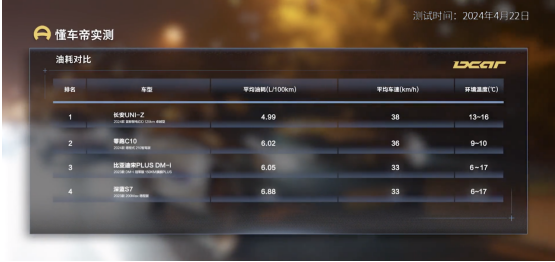 此次实测中,懂车帝也对长安UNI-Z进行了馈电油耗测试。测试结果显示,长安UNI-Z的馈电综合油耗全场最低,为4.99升/百公里,一同测试的比亚迪宋PLUS DM-i、零跑C10和深蓝S7均超过6升/百公里,和宋PRO DM-i实测的4.76升/百公里的测试成绩相比也仅略微高出。从成本来看,懂车帝此次实测的4台测试车均加注92号汽油,以测试当天北京92号汽油8.25元/升的价格计算,长安UNI-Z每公里燃油成本仅为0.41元,同样为测试的四台车中最低。
