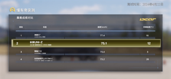 在百公里加速以及制动环节中,长安UNI-Z同样拿出了优异表现,高电量状态下百公里加速最佳时间为8.13秒,在百公里刹停项目中则取得了39.22米的最佳成绩。两项数据均优于宋PRO DM-i和宋PLUS DM-i。
