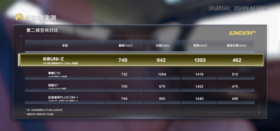 懂车帝也通过HPM标准测试假人对长安UNI-Z的空间表现进行了实测。测试显示,长安UNI-Z表现优秀,第一排高度989mm,用户最为关注的第二排腿部空间也达到了749mm,膝部空间接近两拳。相较于其他竞品,长安UNI-Z与宋PLUS DM-i的第二排腿部空间在此次测试中并列第一。