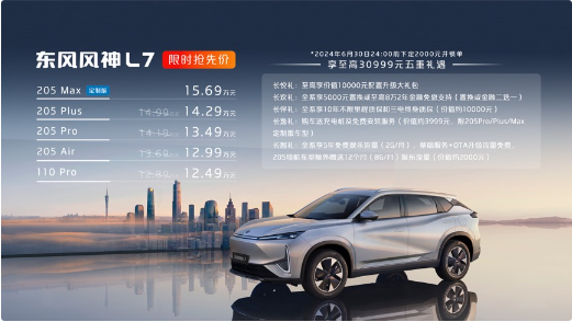 目前,东风风神L7限时抢先价为12.49万元-15.69万元,上市同时,东风风神L7还带来惊喜不断的购车权益,2024年6月30日24:00前下定2000元并锁单的用户,提供至高30999元五重礼遇,助力用户开启更加美好的拥车生活。