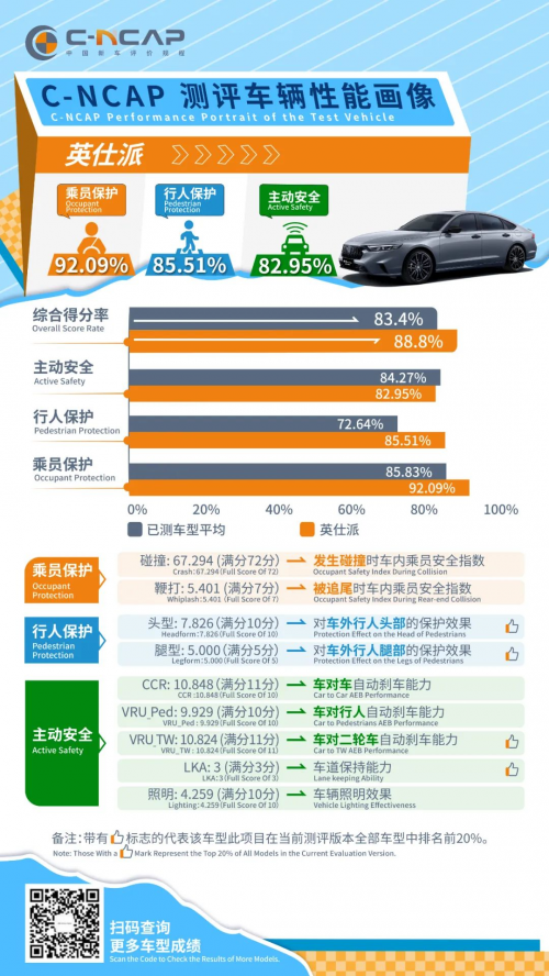 除了在乘员保护测试中交出满意答卷,英仕派对行人安全的保护同样表现优秀。全新英仕派配备PUH引擎盖行人碰撞防护系统,通过保险杠传感器感应,快速启动反应装置排出气体,以弹起引擎盖形成缓冲空间,减轻对行人关键部位的冲击。基于可靠的被动防护设计,英仕派在乘员保护板块得分率92.09%,行人保护板块得分率85.51%,两大板块的成绩均远超测评平均水平。