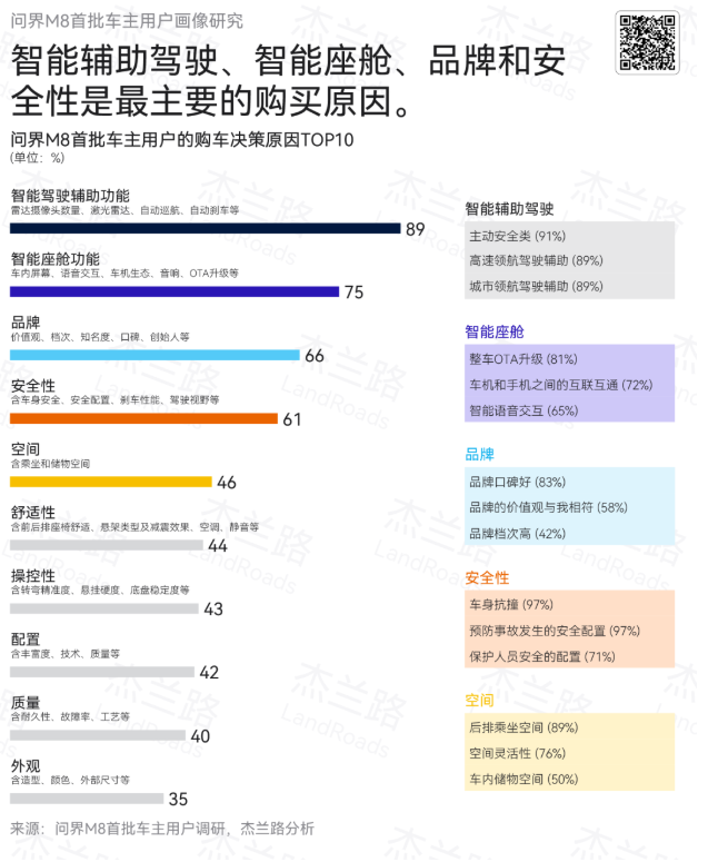 杰兰路《问界 M8 首批车主用户画像研究》清晰地勾勒出高端新能源汽车消费决策的关键转变:安全,已从幕后走向台前,从基础保障跃升为核心价值锚点。 在智能化、电动化浪潮下,以安全为核心构筑的技术与品牌护城河,正成为赢得用户信任、引领市场格局的决定性力量。