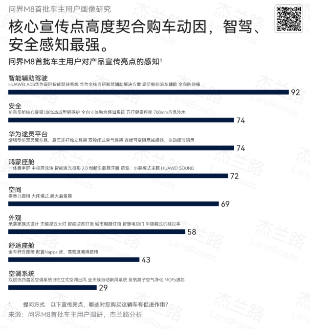 用户对问界M8产品亮点的感知也充分佐证了安全的核心地位。杰兰路针对“问界M8首批车批车主用户对产品宣传亮点的感知”的调研结果显示:用户对“辅助驾驶系统”的感知(92%)及“整车安全性”的感知(74%)最为突出,分别高居第一、第二位。