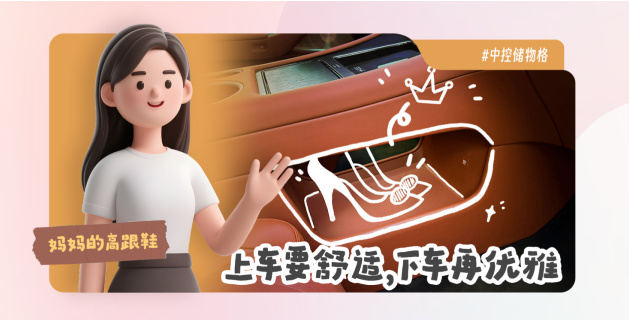 问界M8中控台下镂空的巨大储物空间,轻松放下女性车主的高跟鞋,上车舒适安全,下车优雅时尚,魅丽出行两全其美。