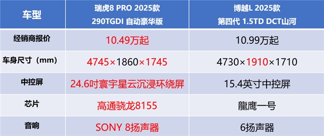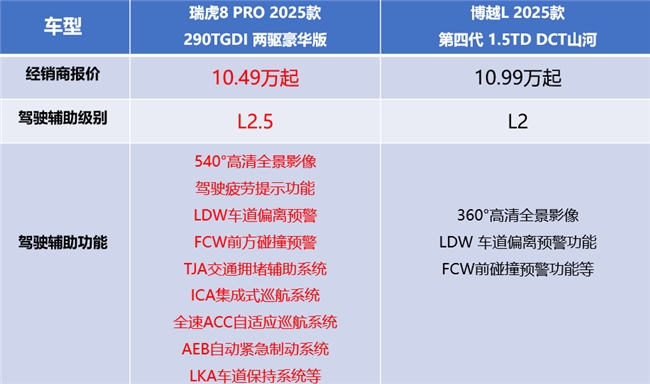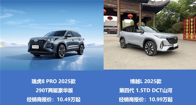 c与此同时,驾乘的舒适性和车辆的安全性能在影响国人购车意愿方面同样起着决定性作用。毕竟,谁不想在出行途中享受惬意与安心呢?而在十万级SUV领域,瑞虎8 PRO与博越L无疑是少数能够满足国人以上购车需求的“尖子生”。那么,如果这两款车狭路相逢,谁更胜一筹呢?接下来,就让我们以价格相近的瑞虎8 PRO 2025款 290T 两驱豪华(以下简称:瑞虎8 PRO)以及博越L 2025款 第四代 1.5TD DCT山河(以下简称:博越L )为例,来看一看谁更能为用户带来“高价值”体验。