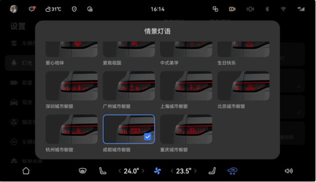 在“智慧重塑豪华”的理念指引下,问界持续创造个性化的智能交互体验。问界M9 2025款后排控制屏新增暮夜空间功能,通过控制屏首页即可一键开启后排全黑模式,关闭天窗遮阳帘、阅读灯、氛围灯、车窗,同时开启隐私玻璃和后排幕布,为用户带来更沉浸的休憩空间。值得一提的是,问界M9全系均新增城市橱窗情景灯语,提供更丰富的场景选择,用户可以为自己的城市应援,也可选择自己喜欢的城市。