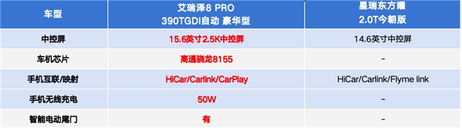 星瑞东方曜·今朝版则配备了14.6英寸中控屏,支持手机互联功能。相对而言,其车机系统未搭载8155芯片,且未提供无线充电与智能尾门功能。在导航流畅度、语音交互响应、设备连接便利性等高频使用场景中,艾瑞泽8 PRO的硬件配置提供了更广阔的可能性。