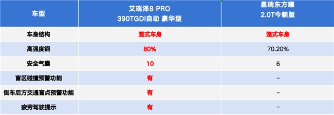 在被动安全层面,艾瑞泽8 PRO基于“笼式车身”打造,高强度钢使用比例高达80%,搭配10个全方位安全气囊,为车内每一位乘客构建“硬核防护罩”;而星瑞东方曜今朝版仅配备6气囊,且高强度钢比例为70.2%,可见艾瑞泽8 PRO在安全上的投入更为全面。