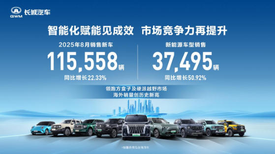 长城汽车8月销售新车115,558辆,同比增长22.33%;